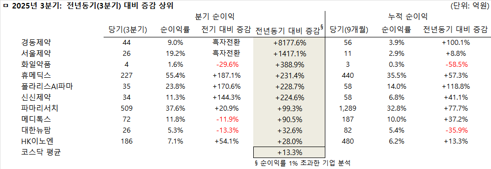 현대약품 (148.8%)은 성장률은 높지만 누적 순이익 절대 금액이 22억 원으로 작고, 이익률도 1.6%에 불과해 아직 이익의 절대 규모는 미미한 수준이다.