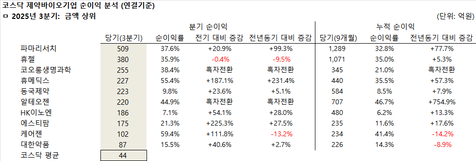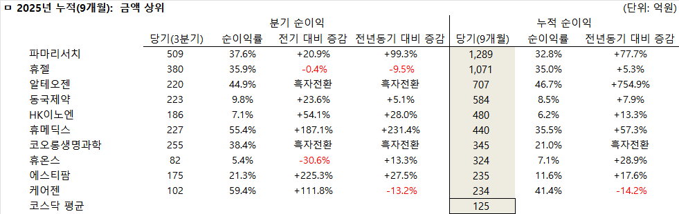 파마리서치 (1,289억 원)와 휴젤 (1,071억 원)이 누적 순이익 1,000억 원을 돌파하며 코스닥 제약바이오의 '양대 산맥'으로 자리 잡았다.