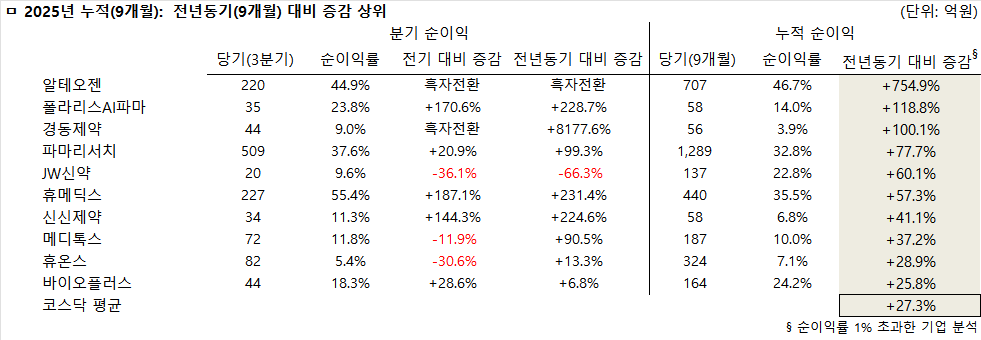 코스닥 제약바이오 기업들의 3분기 누적 순이익은 전년 동기 대비 평균 27.3% 증가했다. 전반적으로 양호한 성장세를 보였다.