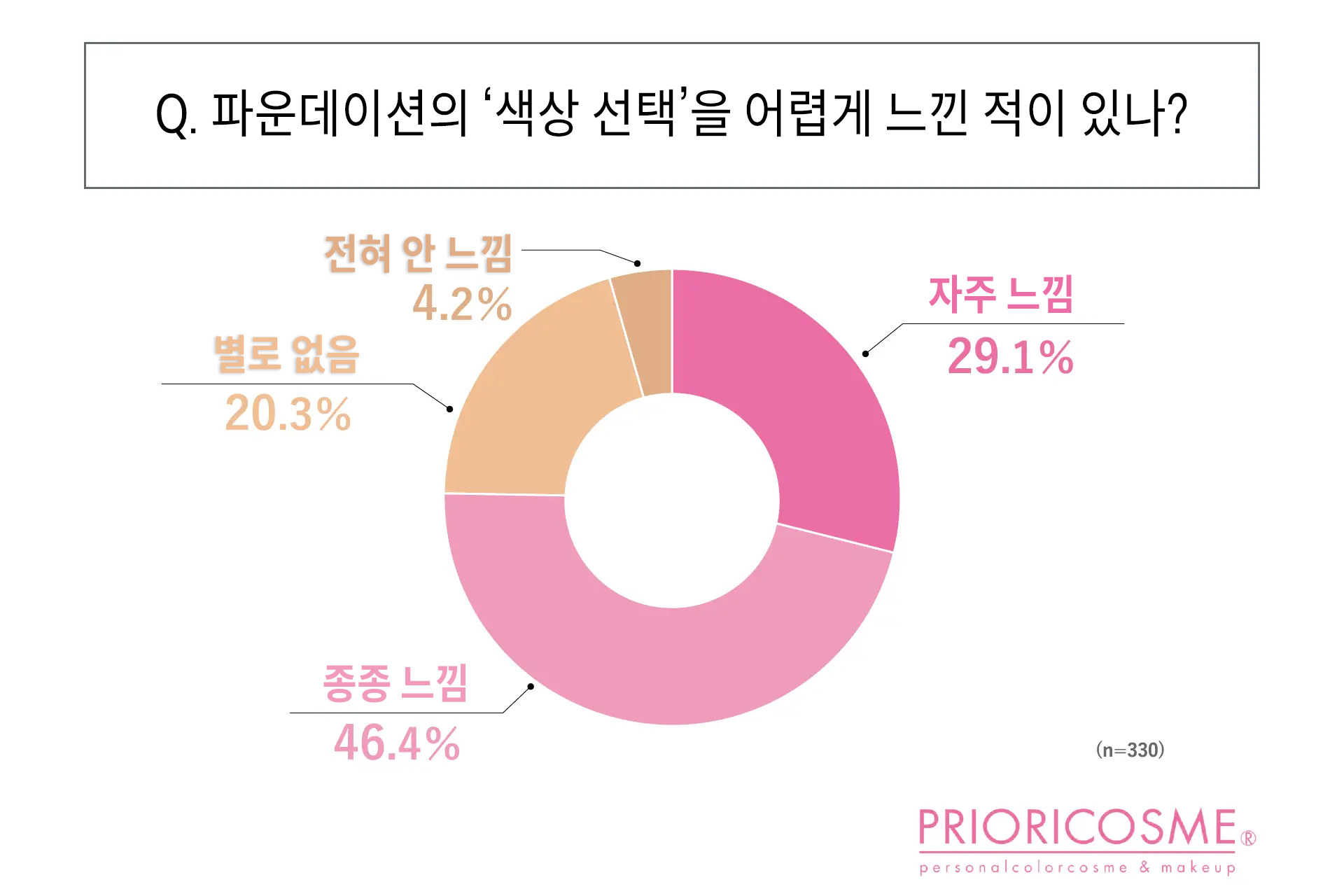 최근 일본의 뷰티기업 프리오리코스메가 메이크업을 하는 일본의 20~50대 여성 직장인 330명을 대상으로 ‘베이스 메이크업 고민’에 대해 묻자 "파운데이션 색상이 맞는지 판단하기 어렵다"고 토로한 응답자가 75%에 달했다.