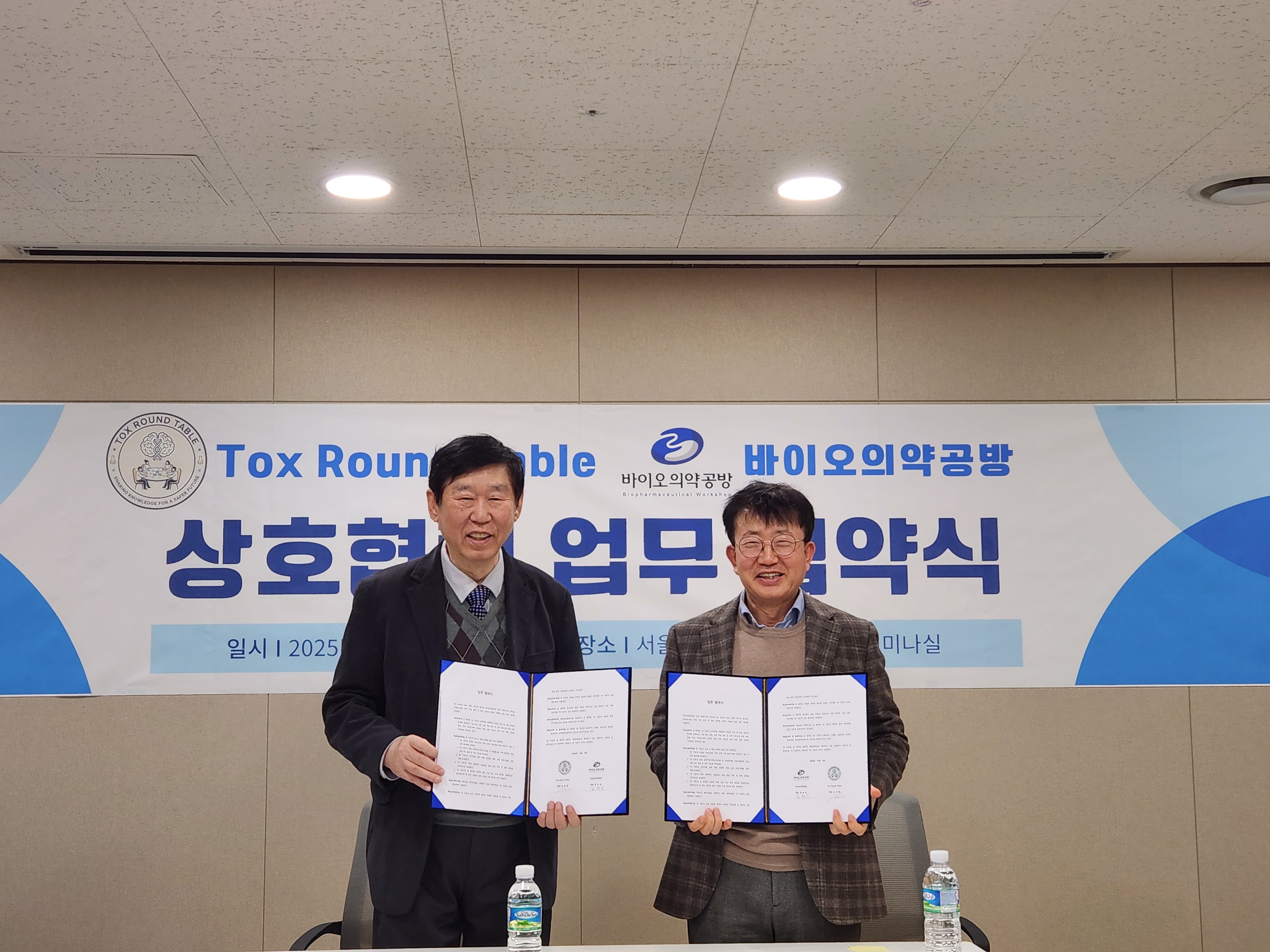 국내 최대 독성학 실무 전문가 커뮤니티 ‘Tox Round Table(대표 손우찬 서울아산병원 병리과 교수, 이하 TRT)’과 바이오의약품 개발·생산 기술 공유 그룹 ‘바이오의약공방(대표 김형순 박사, 이하 공방)’은 지난 8일 서울아산병원에서 상호 협력을 위한 양해각서(MOU)를 체결했다고 11일 밝혔다. 협약식은 서울아산병원 동관 세미나실에서 양측 주요 운영진 및 관계자들이 참석한 가운데 진행됐다.