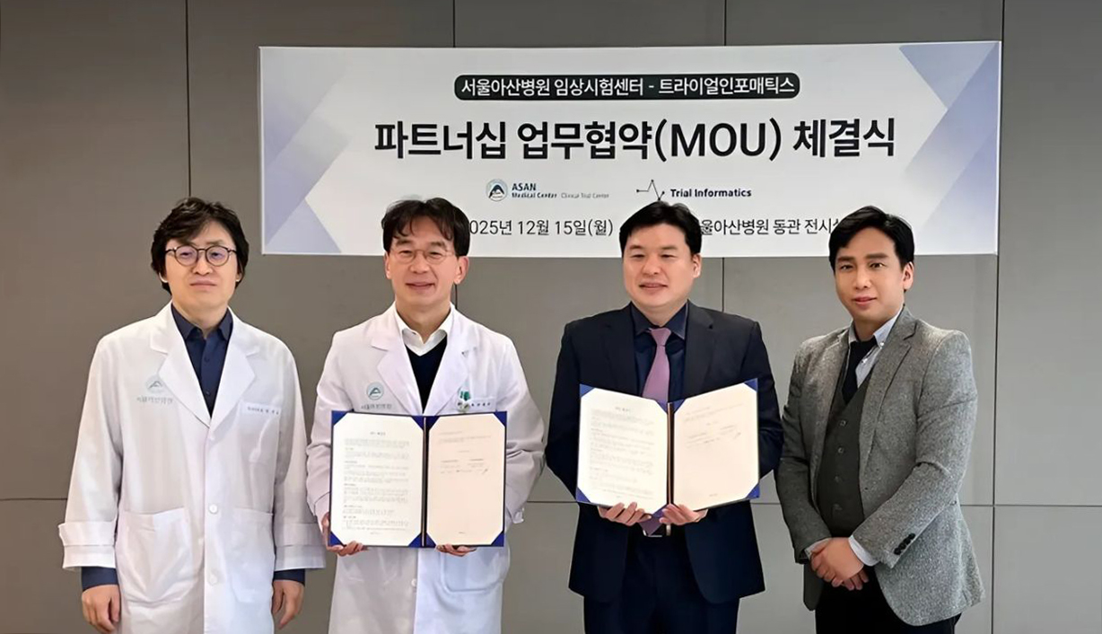 AI 기반의 임상시험 IT 솔루션 전문기업 트라이얼인포매틱스(대표 김경원, 윤병인)는 15일 서울아산병원 임상시험센터(센터장 반준우)와 업무협약(MOU)을 체결하고, 임상시험 영상 데이터 관리·분석 및 연구 솔루션 개발을 위한 전략적 파트너십을 구축했다고 16일 밝혔다.