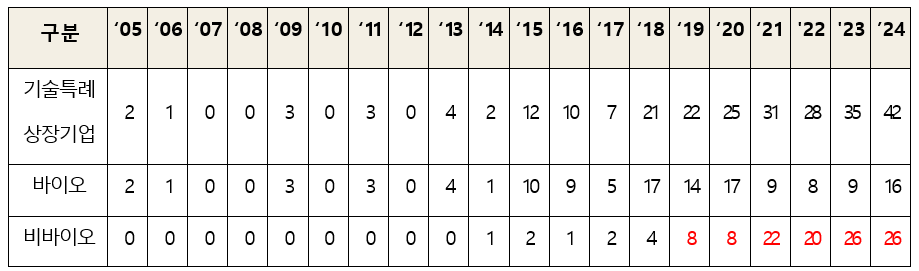 한국거래소 자료에 따르면, 기술특례상장으로 코스닥에 입성한 바이오 기업은 2005년 도입 이후 현재까지 누적 150개사에 달하는 것으로 집계됐다. 바이오 범위에 따라 차이가 있으나, 전체 기술특례 상장사 중 약 60%에 해당하는 압도적인 비중을 보이고 있다.