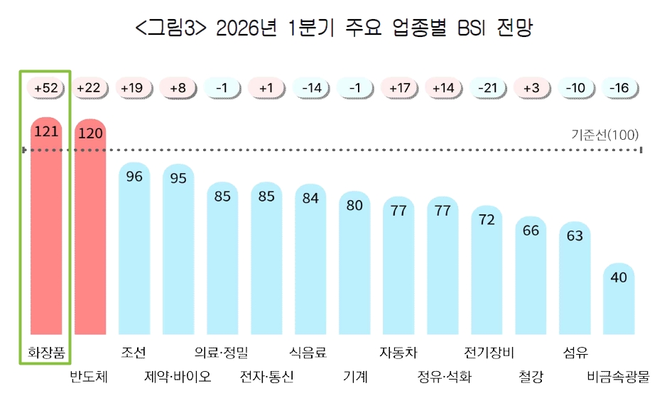 대한상공회의소가 29일 발표한 ‘2026년 1분기 기업전망지수(BSI)’에 따르면 화장품 제조업의 내년 1분기 전망지수는 121로, 올해 4분기(69) 대비 52 포인트나 상승했다. 조사 대상 14 업종 중 반도체(120)와 함께 유일하게 기준치 100을 넘었다. BSI는 100을 기준으로 그 이상이면 경기 전망이 긍정적이고, 미만인 경우엔 부정적 전망이 우세한 것으로 해석한다.