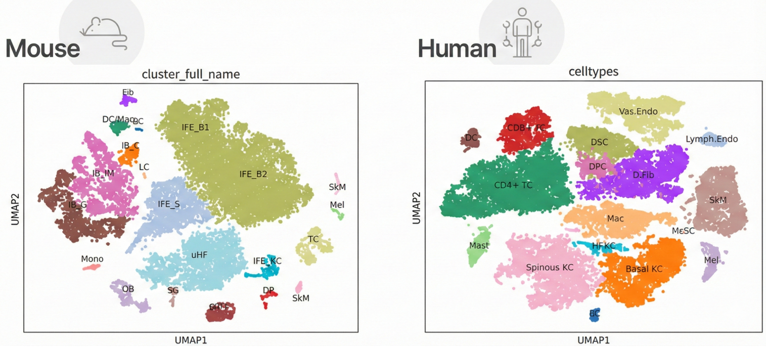 에피바이오텍은 이 문제를 극복할 방안을 찾았다. 오픈소스로 공개된 인간 두피 단일세포 데이터를 자사 분석 체계에 맞게 재분류하고, 동일한 기준으로 구축한 마우스 단일세포 데이터와 직접 비교 분석했다. 단순히 유전자 존재 여부를 비교하는 수준이 아니라, 세포군 단위에서 발현 강도와 패턴, 질환 조건에 따른 반응 양상을 함께 분석했다.