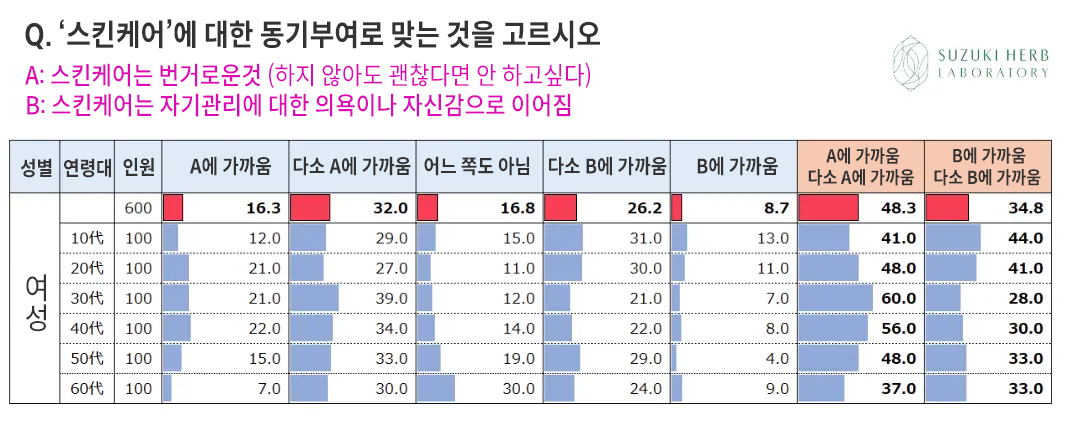 주식회사 스즈키 허브 연구소가 일본의 10대부터 60대까지 여성 600명을 대상으로 실시한 ‘클렌징과 스킨케어에 관한 조사’에 따르면, 전체 응답자의 48.3%는 스킨케어를 ‘귀찮은 것’으로 인식하는 쪽에 가까웠다. 세부적으로 보면 ‘귀찮다’는 응답이 16.3%, ‘다소 귀찮다’는 응답이 32.0%였다. 반면 ‘스킨케어는 자기관리에 대한 의욕이나 자신감으로 이어진다’는 응답은 34.8%로, ‘그렇다’ 8.7%와 ‘다소 그렇다’ 26.2%를 합친 수치다. 스킨케어에 대한 긍정적 인식보다 부담감이 앞선다는 응답이 더 많다는 점에서, 스킨케어가 일상적 루틴으로 정착했음에도 심리적 거리는 여전히 있는 것으로 보인다.