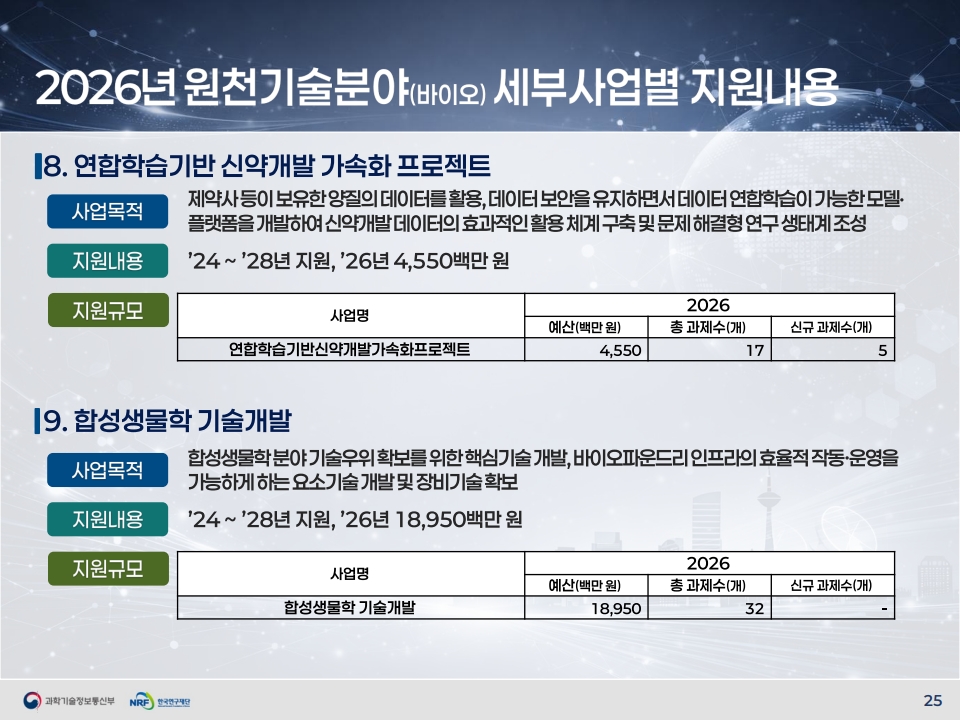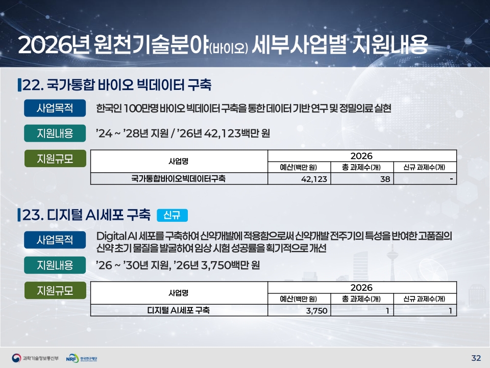 과기정통부는 올해 바이오 원천기술 분야 총 23개 사업에 약 7458억원을 집중 투입한다. 이는 정부 전체 바이오헬스 R&D가 아닌, 과기정통부 내 원천기술개발(바이오)로 분류된 트랙의 합산 수치다. 원천기술 중심의 바이오 R&D에만 이 정도 규모의 예산이 편성됐다는 점에서 정책적 무게감이 작지 않다.