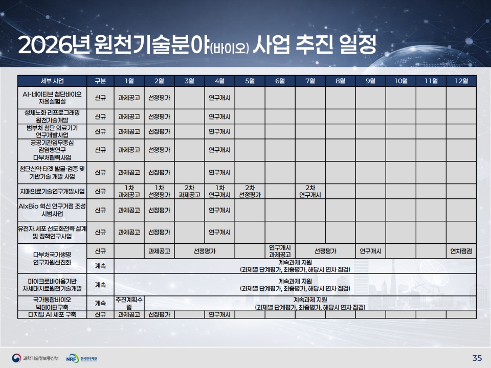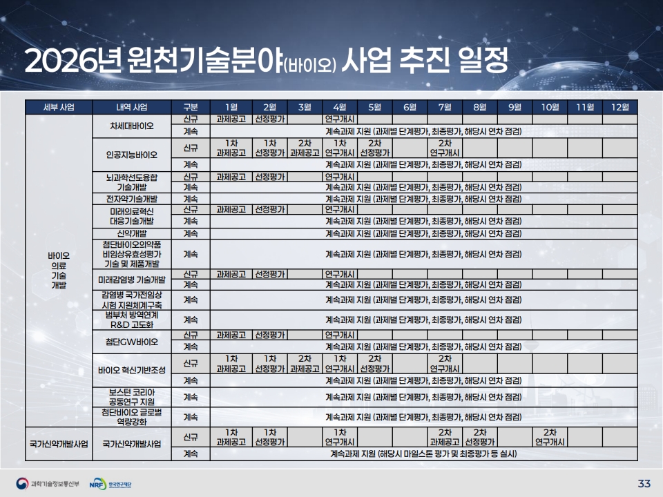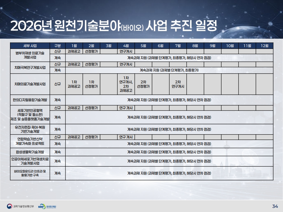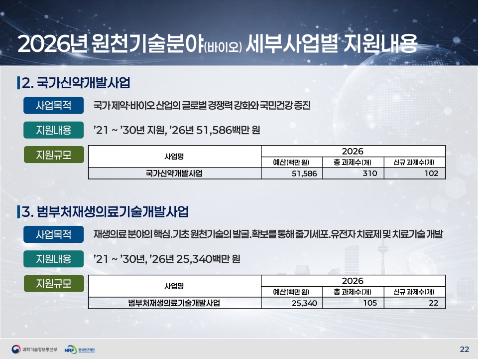 신약, 줄기세포, 첨단의료기술 등 국민 생명과 직결된 핵심 분야를 포괄하면서도 특정 기술이나 접근법에 쏠리기보다는 다양한 연구가 진행될 수 있도록 설계됐다. 단기적인 성과 창출보다는 원천기술 단계에서의 실패 가능성을 전제로 한 폭넓은 탐색을 허용하겠다는 정책 기조가 반영됐다.