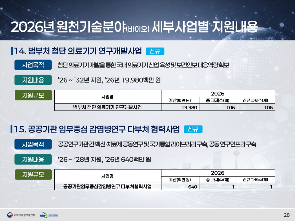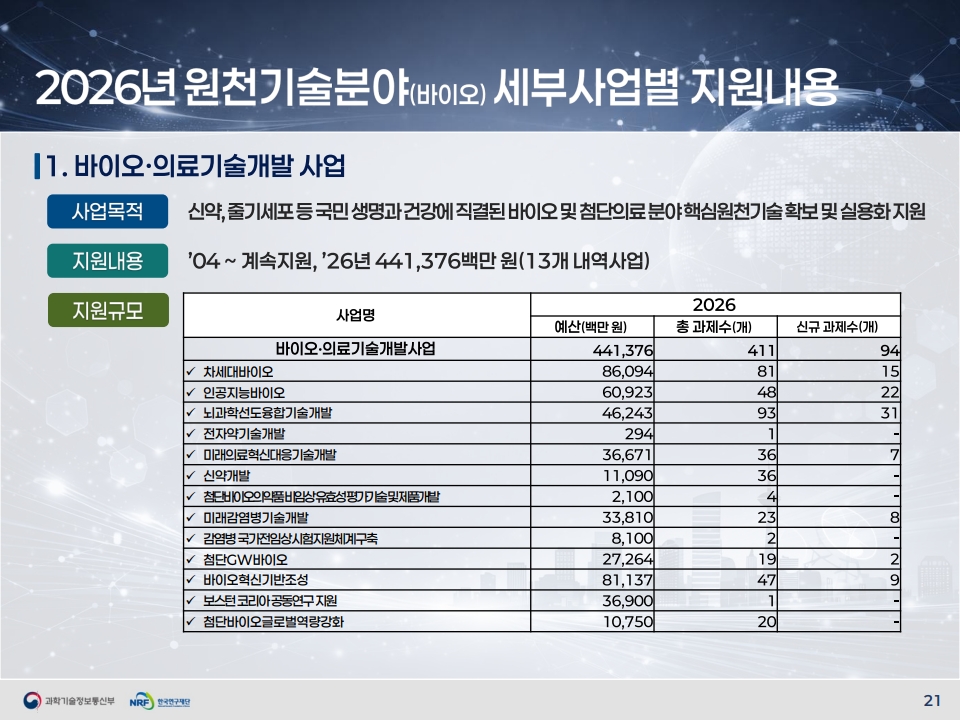 이 가운데 가장 큰 비중을 차지하는 사업은 바이오·의료기술개발사업이다. 올해 예산은 4413억7600만원으로, 바이오 원천기술 분야 전체 예산의 절반을 넘는다. 특히 신규 과제가 94개에 달한다.