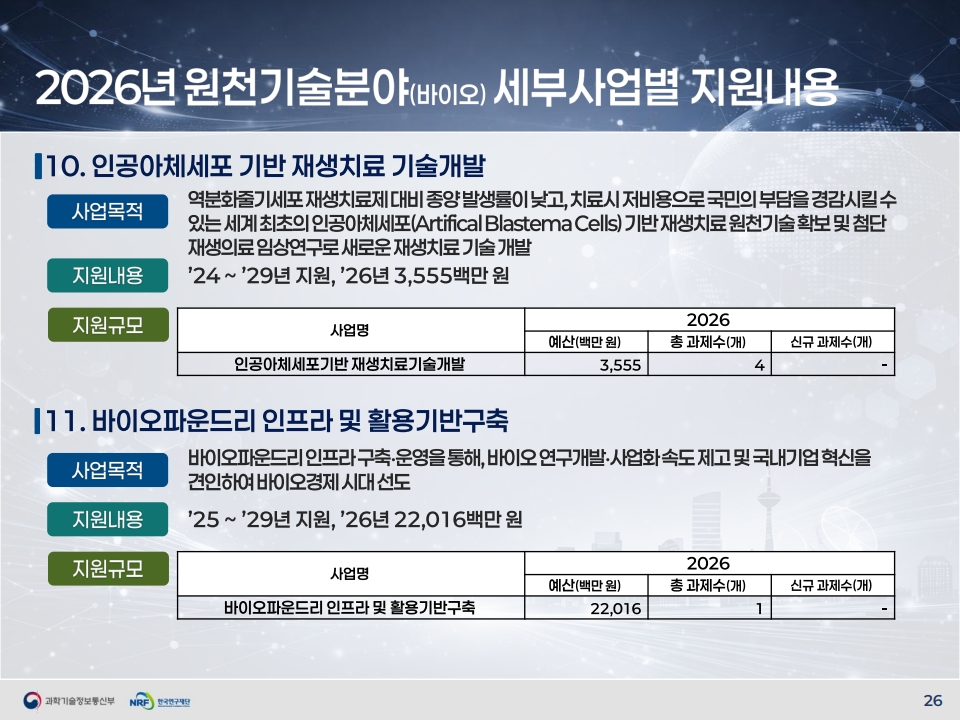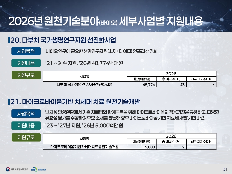 과기정통부는 데이터와 연구자원 인프라 확충에도 집중할 계획이다. 다부처 국가생명연구자원 선진화사업 488억원, 국가통합 바이오 빅데이터 구축 421억원이 각각 배정됐다. 특히 국가통합 바이오 빅데이터 구축 사업은 한국인 100만명 규모 바이오 데이터 확보를 목표로 한다. 정밀의료, 신약개발, 임상 연구 전반의 기반을 마련하겠다는 구상이다.