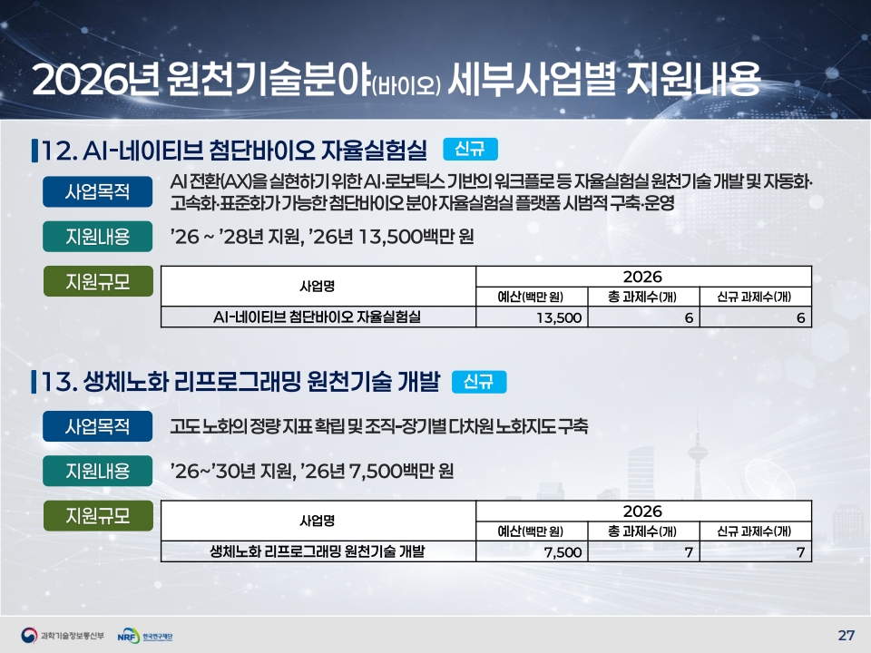대표적인 사업이 AI-네이티브 첨단바이오 자율실험실이다. 예산은 135억원이다. AI와 로보틱스를 기반으로 실험 설계부터 수행, 데이터 축적까지 전 과정을 자동화·표준화하는 것을 목표로 한다. 반복 실험과 조건 최적화에 소요되는 시간과 비용을 구조적으로 줄이고, 연구 결과의 재현성과 일관성을 높이겠다는 계획이다.