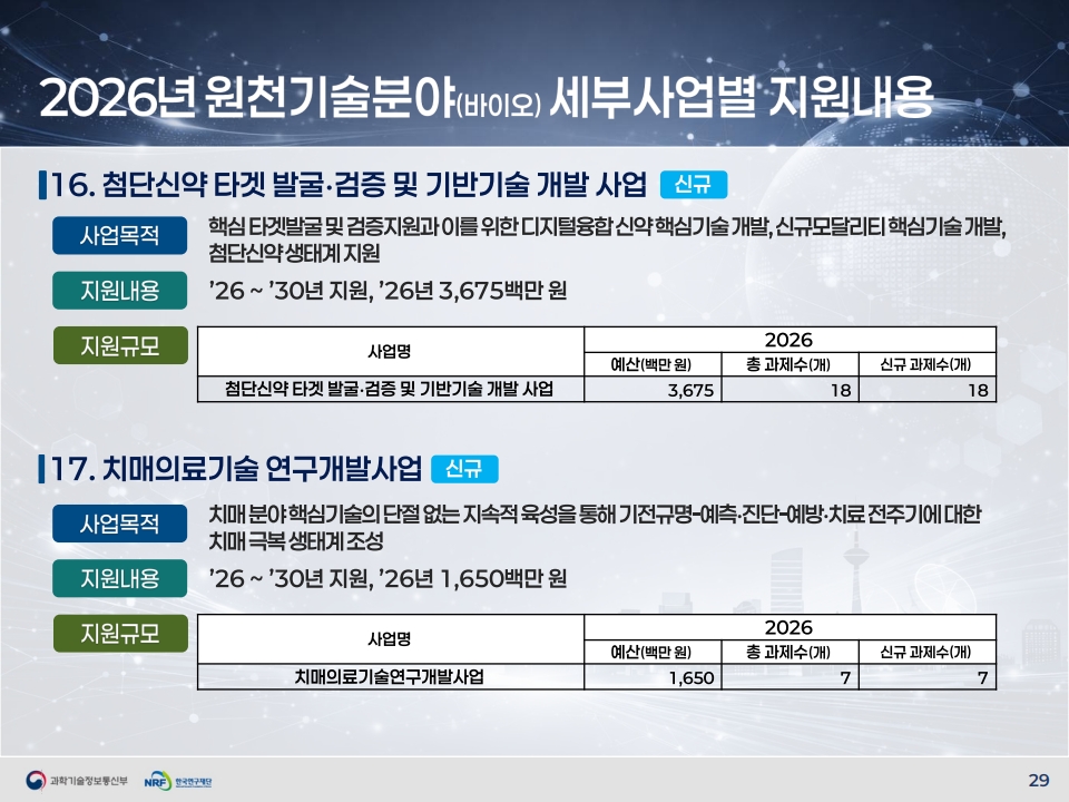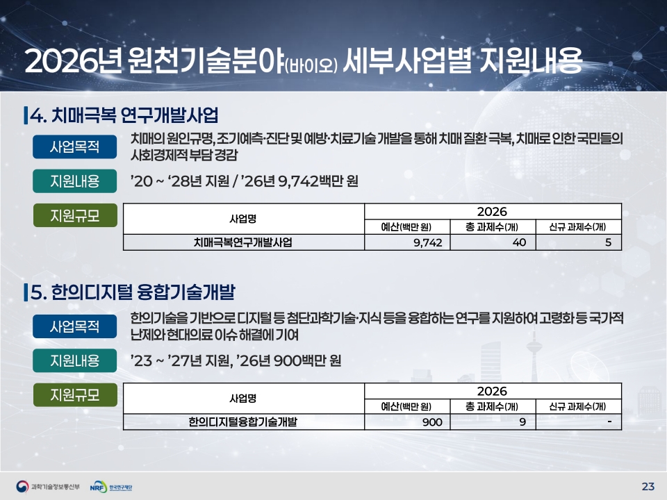 치매 분야는 이중 구조로 재편됐다. 기존 치매극복연구개발사업(97억원)에 더해, 올해부터 치매의료기술 연구개발사업(17억원)이 신규 추진된다. 원인 규명과 조기 예측을 넘어 진단·예방·치료 전주기를 단절 없이 육성하겠다는 구상이다.