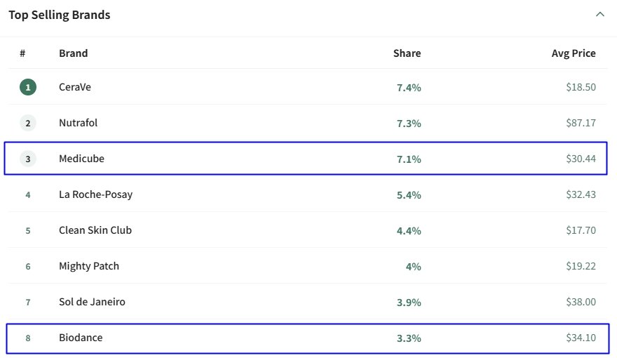 특히 메디큐브(Medicube)와 바이오던스(Biodance)는 이 방식으로 상위권에 성공적으로 안착했다. 내비고 집계 아마존 스킨케어 매출 점유율 순위에서 메디큐브(7.1%)는 3위, 바이오던스(3.3%)는 8위에 오르는 성과를 냈다. 제품으로는 바이오던스 '바이오 콜라겐 리얼 딥 마스크'(3.3%), 메디큐브 '제로 모공 패드 2.0'(3.2%)가 '베스트셀링 제품' 순위 4, 5위를 각각 차지했다.