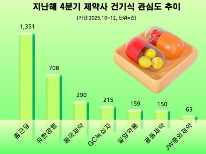 지난해 4분기 주요 제약사들 중 종근당이 가장 높은 건강기능식품 관심도(정보량=포스팅 수)를 기록했다. 유한양행과 동국제약이 그 뒤를 이었다.
