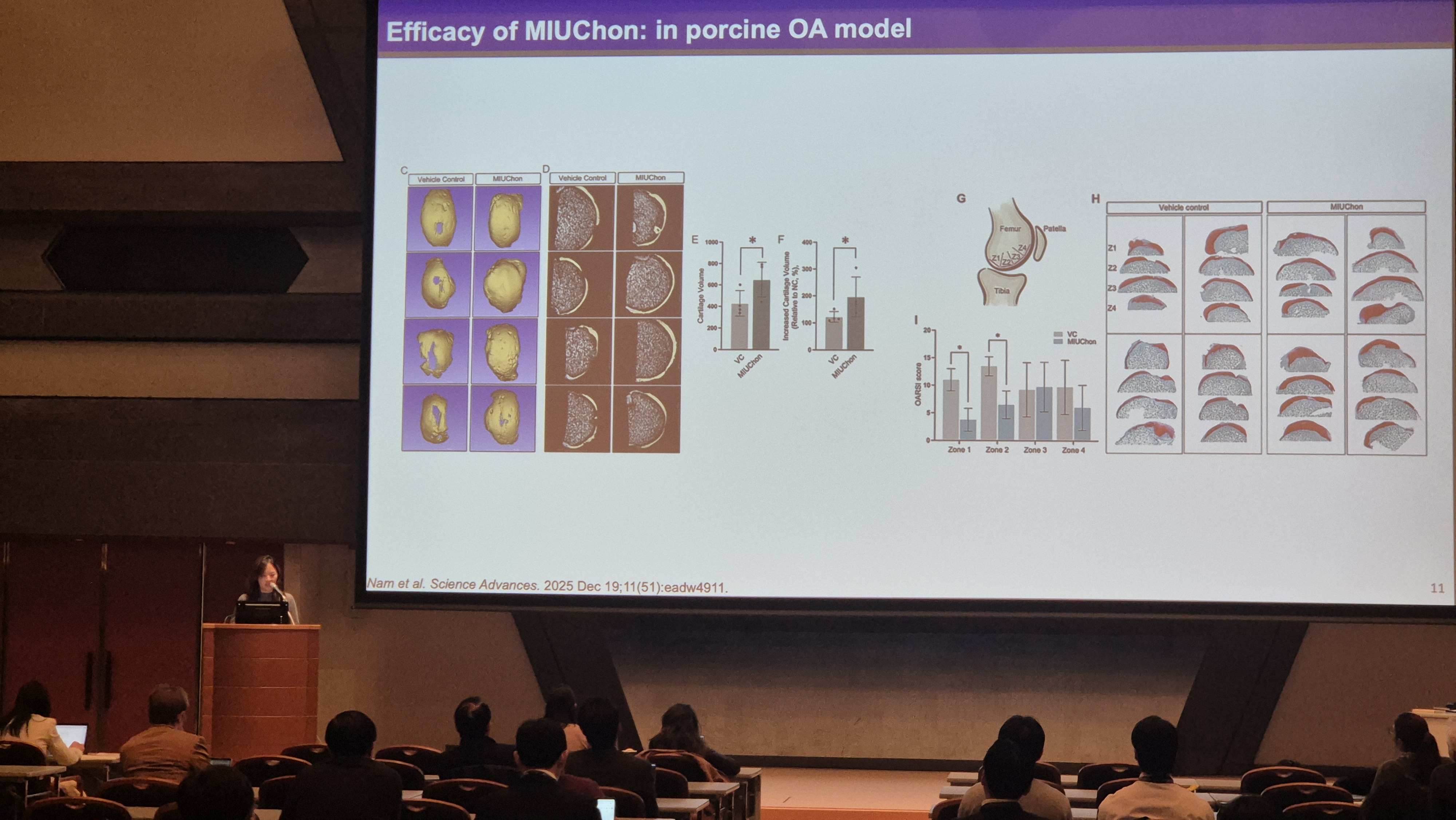 이 같은 국제 학술 무대에서 임예리 교수는 iPSC 기술을 실제 환자 치료로 연결한 임상 연구 사례를 제시했다. 임 교수는 MIUChon 임상 투여 전략과 함께 무작위 대조·위약 대조·이중맹검(randomized, placebo-controlled, double-blind) 설계를 기반으로 한 임상 연구 구조를 설명하고, 이를 통해 확보된 안전성 및 유효성 평가 결과를 소개했다. 특히 MRI 기반 연골 구조 변화 분석과 통증 감소, 관절 기능 개선 등 주요 임상 지표를 중심으로 연구 성과를 체계적으로 발표했다.