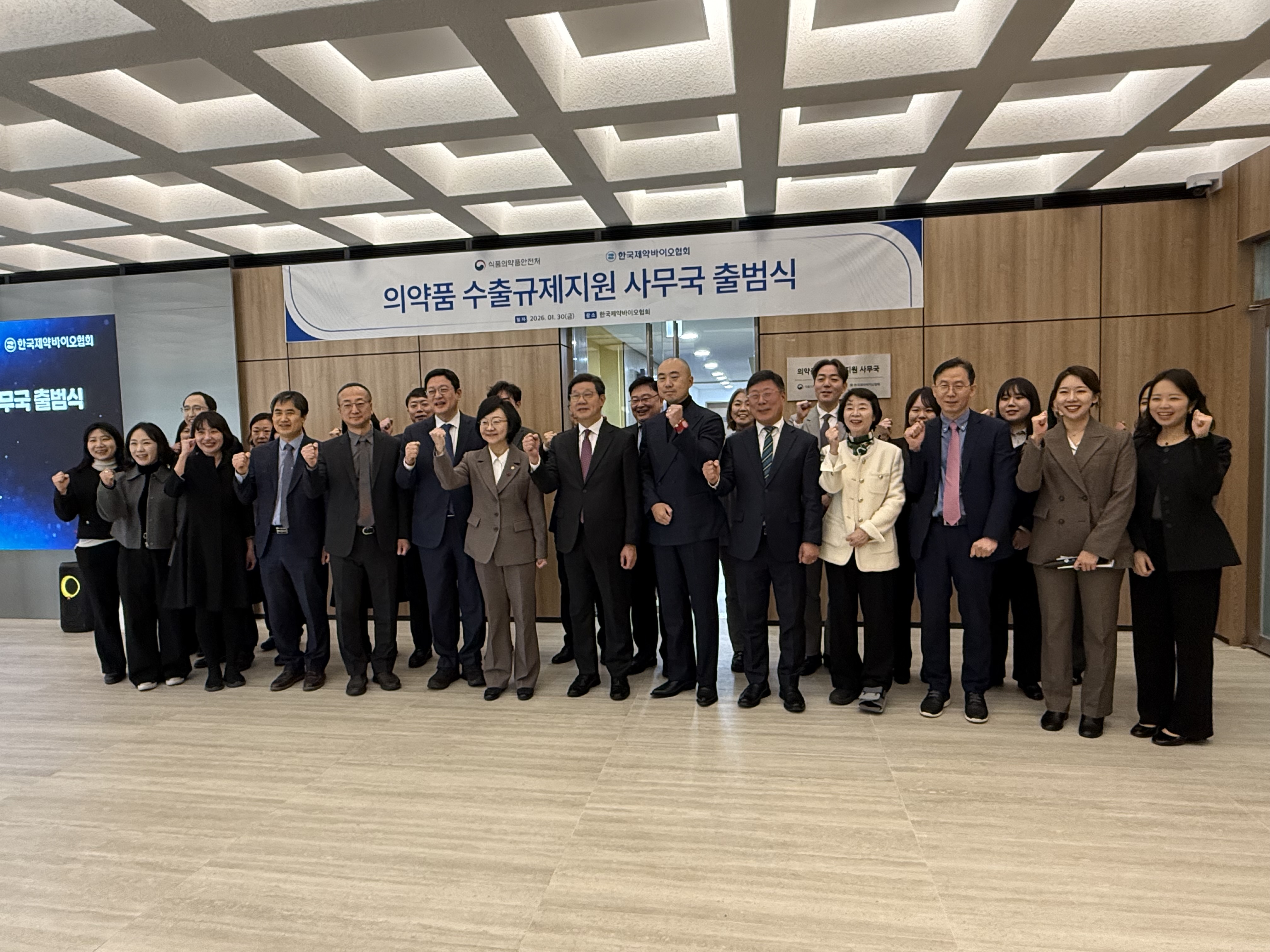한국제약바이오협회와 식약처는 30일 오전 서울 방배동 제약바이오협회 회관에서 ‘의약품 수출규제지원 사무국(이하 사무국)’ 출범식을 개최하고 본격적인 운영에 들어갔다. 이날 출범식에는 오유경 식약처장과 노연홍 한국제약바이오협회장을 비롯해 유관 기관 및 업계 관계자들이 참석해 현판 제막식을 갖고 사무국 직원들을 격려했다.