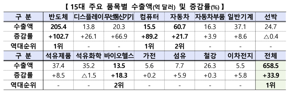 전체 15대 주력 수출 품목 가운데 바이오·헬스는 수출 증가율 기준 상위권을 기록했다. 반도체(+102.7%), 컴퓨터(+89.2%), 무선통신기기(+66.9%)에 이어, 바이오·헬스는 18.3% 증가로 주요 산업 중 안정적인 성장 축으로 자리매김했다.