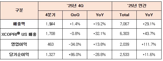 SK바이오팜(대표이사 사장: 이동훈)이 2025년 4분기 및 연간 실적 발표를 통해 연 매출 7,067억원, 영업이익 2,039억원을 달성했다고 6일 밝혔다. 연간 영업이익은 약 112% 성장하며 전년 대비 2배 이상으로 수직 상승했으며, 당기순이익은 연간 2,533억원을 기록했다. 4분기 매출은 1,944억원, 영업이익은 463억원으로 집계됐다.