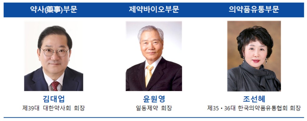이번 수상자 선정은 지난 1월 16일 개최된 제7회 대한민국 약업대상 주관단체장(권영희 대한약사회장, 노연홍 한국제약바이오협회장, 박호영 한국의약품유통협회장) 회의에서 결정됐으며, 시상식은 오는 26일 대한약사회 제72회 정기대의원총회 석상에서 진행한다.