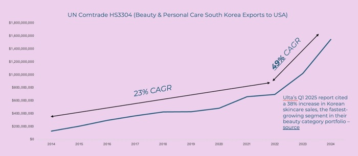 보고서는 2024년 미국의 한국산 화장품 수입액이 17억달러(약 2조3800억원)로 전년 대비 54% 증가했다고 밝혔다. 2014~2021년 연평균 23% 성장에서 2022~2024년에는 49%로 성장 속도가 가팔라졌다. 단발성 히트가 아니라 구조적 수요가 형성됐다는 신호로 해석된다.