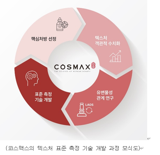 코스맥스가 개발한 텍스처 표준 측정 기술은 화장품 발림성과 유변물성(물질의 점도, 탄성 등) 간의 관계를 규명하고, 기계학습(machine learning)을 이용해 화장품의 사용감을 구체적이고 정량화된 수치로 나타낸다. 사람의 개입 없이 텍스처의 수준 측정이 가능해 제품 개발 시간을 단축하고 품질 검증 속도를 높일 수 있다. 원하는 대로 사용감을 정밀하게 조정해 맞춤형 화장품 개발 등에 폭넓게 적용 가능하다.