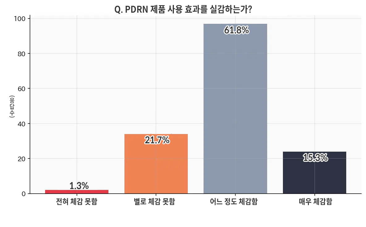 설문 결과, PDRN 스킨케어 제품을 사용해 본 경험이 있는 응답자 중 84.3%가 ‘피부 개선 효과를 실감했다’고 답했다. 세부적으로는 ‘어느 정도 실감했다’가 62.8%, ‘매우 실감했다’가 21.5%를 기록하며 사용자의 대다수가 성분의 효능에 대해 긍정적인 반응을 보였다. 설문 보고서는 응답 결과를 바탕으로 "한 번 제품을 접한 소비자가 이탈하지 않고 정착하는 고착화 단계에 진입했다"고 해석했다.