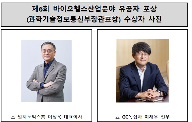 제6회 바이오헬스산업분야 유공자 표창식에서는 △ 난치성 질환 혁신 치료제 개발 및 글로벌 제약사 일라이 릴리와 1조 9,000억 원 규모 기술이전 체결에 기여한 알지노믹스 이성욱 대표이사 △ 유전자 재조합 탄저 백신 ‘배리트락스주(국산 39호 신약)’ 세계 최초 개발과 국내 품목허가 승인에 기여한 GC녹십자 이재우 전무가 과학기술정보통신부 장관 표창을 수상한다.
