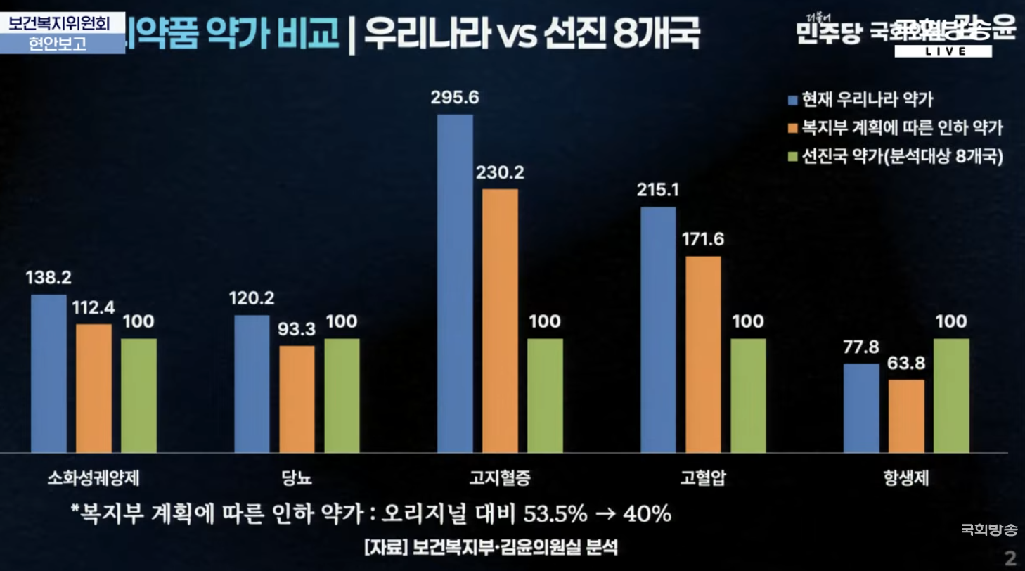김윤 의원은 선진국 약가와의 비교를 통해 "항생제 같은 경우는 지금도 선진국에 비해서 약가가 낮은데, 여기서 더 깎으면 아예 공급 부족이 일어나는 수준"이라고 꼬집었다. 반면 "고지혈증 약 같은 경우는 선진국 대비 거의 3배 수준이어서, (정부 안대로) 낮춰봤자 2.3배 수준에 불과해 제네릭 약가 거품을 실질적으로 걷어내지 못한다"고 강하게 비판했다.