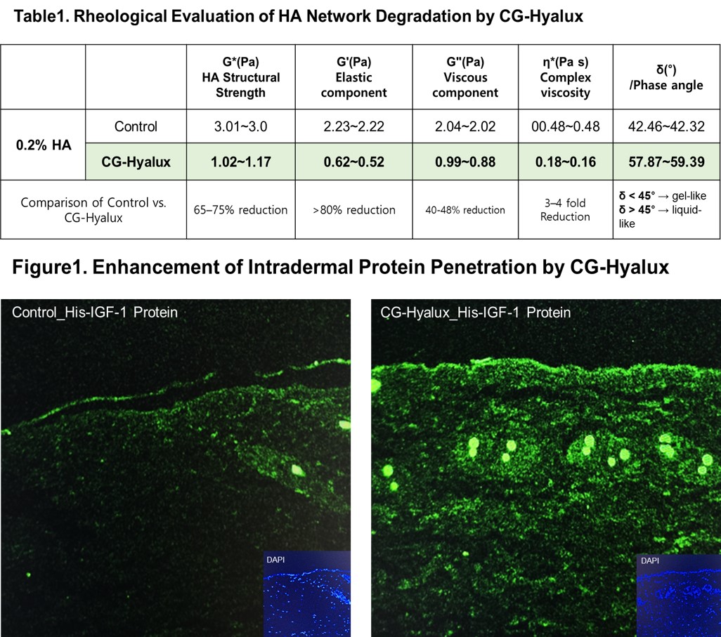 케어젠이 수행한 물성 분석 결과에 따르면, CG-Hyalux 처리 시 0.2% HA 시스템의 구조 강도(G)는 약 65% 감소했으며, 탄성 성분(G')은 최대 75% 감소했다. 동시에 위상각(δ)은 42°에서 약 59°로 증가해, 기존 gel-dominant 구조가 liquid-dominant 상태로 전환됨을 확인했다. 이는 히알루론산의 물리적 얽힘(entanglement)과 교차결합이 완화되면서 조직 내 확산 저항이 감소했음을 의미한다고 회사 측은 설명했다. 실제 피부 조직 단면 실험에서도 CG-Hyalux를 적용한 군에서 시험에 사용된 단백질의 표피 및 진피층 침투가 대조군 대비 현저히 증가한 것이 확인됐다. 또 단순한 농도 증가가 아닌, 조직 전반에 걸친 균일한 분포도 관찰됐다.