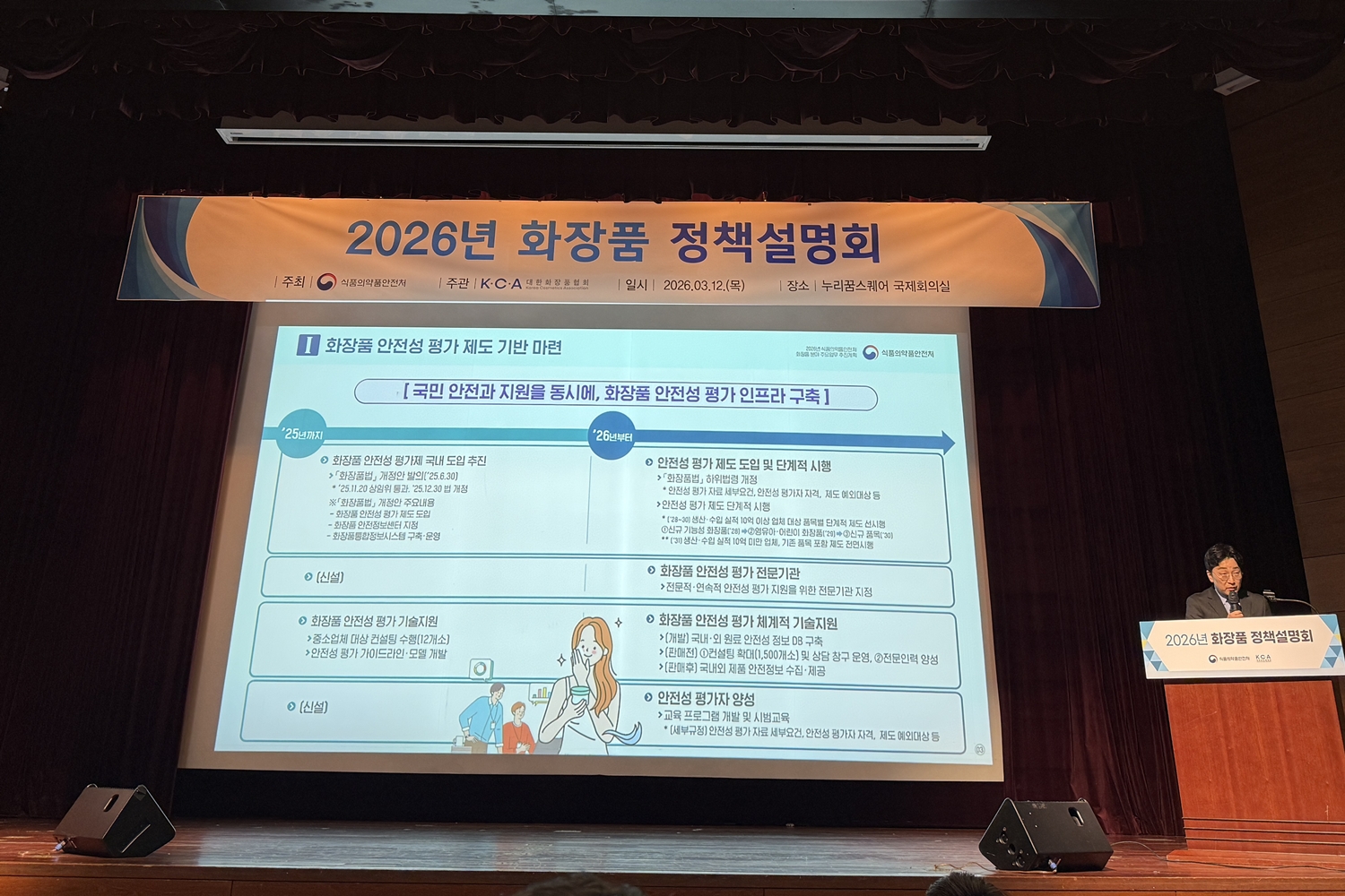 12일 서울 마포구 누리꿈스퀘어에서 식약처와 대한화장품협회가 개최한 '2026년 화장품 정책 설명회'에서 식약처는 이 같은 방침을 밝히고, 화장품산업 지원 '컨트롤타워'로서 역할하겠다고 발표했다.