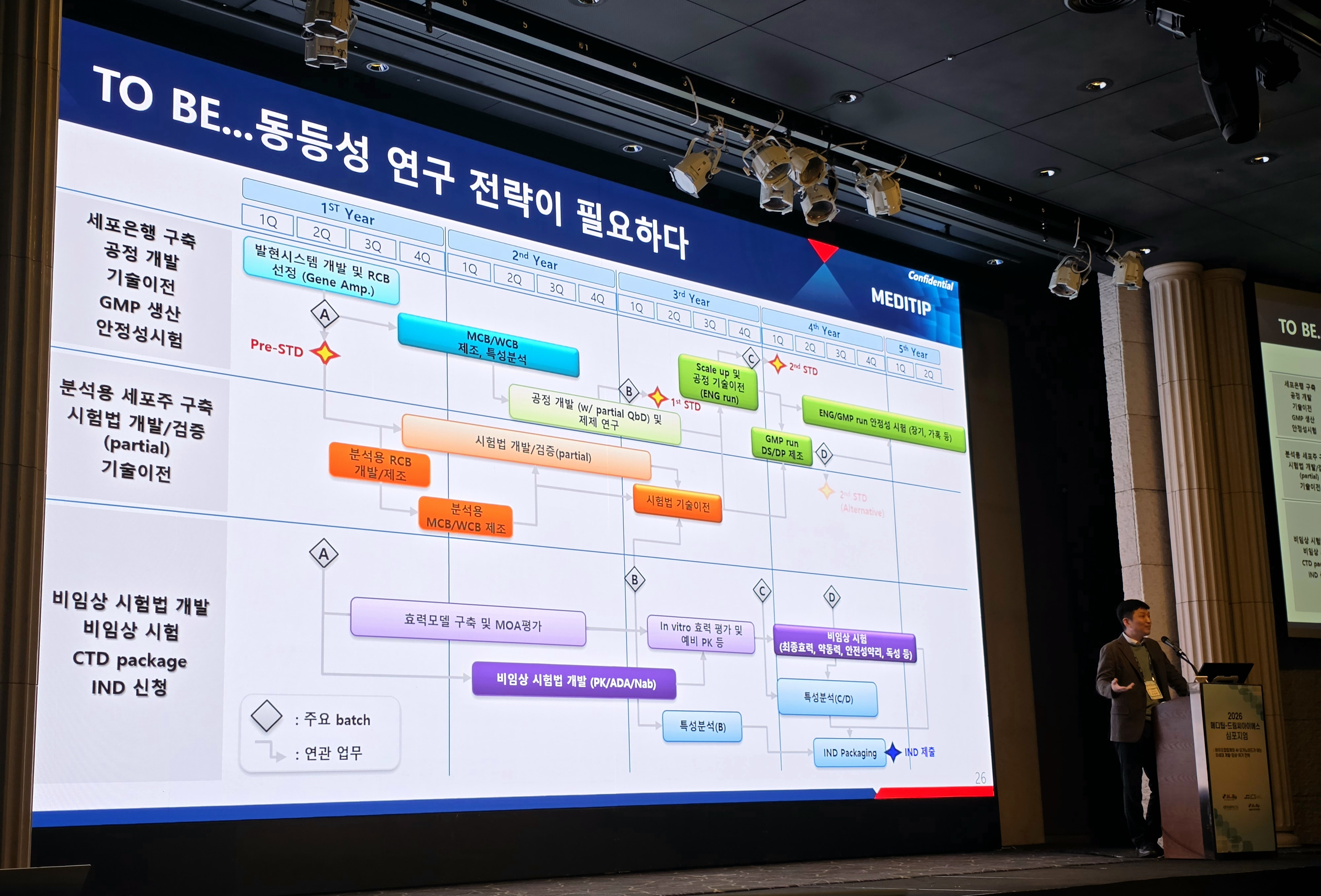 메디팁 의약품본부 김성주 상무는 12일 서울 양재 엘타워에서 열린 ‘2026년 메디팁-드림CIS 심포지엄’에 연사로 나서, ‘바이오접합체 CMC 효율적 설계-From LAB to GMP’를 주제로 발표했다.