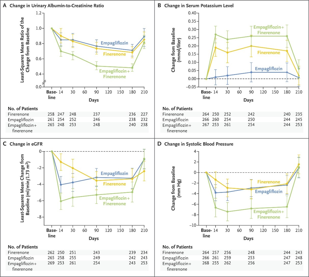 이후 진행된 임상 연구에서는 기존 치료제와의 병용요법에 대한 효과도 평가됐다. CONFIDENCE 2상 연구는 2형 당뇨병을 동반한 만성콩팥병 환자 807명을 대상으로 케렌디아와 SGLT-2 억제제 병용요법을 단독요법과 비교한 연구다. 치료 180일 시점에서의 UACR 변화율을 평가한 결과, 병용요법군은 기저 대비 52% 감소를 나타냈다. 이는 케렌디아 단독요법에서 나타난 23% 감소와 SGLT-2 억제제 단독요법의 20% 감소 대비 각각 추가적인 감소 효과가 확인된 수치로, 병용 치료 전략에서의 단백뇨 개선 효과를 보여주는 결과로 보고됐다.
