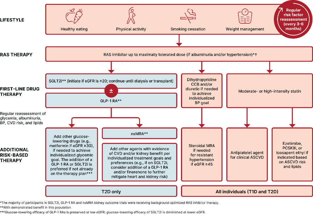 가이드라인에서도 이러한 임상 근거를 반영한 변화가 확인됐다. 2026년 미국당뇨병학회(ADA) 가이드라인에서는 만성콩팥병을 동반한 당뇨병 환자의 위험 관리 전략에서 케렌디아와 SGLT-2 억제제 병용요법이 고려 가능한 옵션으로 제시됐다. 해당 권고는 CONFIDENCE 연구에서 확인된 알부민뇨 개선 효과를 기반으로 하며, 근거 수준은 B로 명시됐다. 또한 비스테로이드성 MR 길항제인 피네레논은 심부전 입원 위험 감소를 목적으로 권고되며, 심혈관 사건 예방 측면에서도 활용되는 치료 옵션으로 포함됐다.