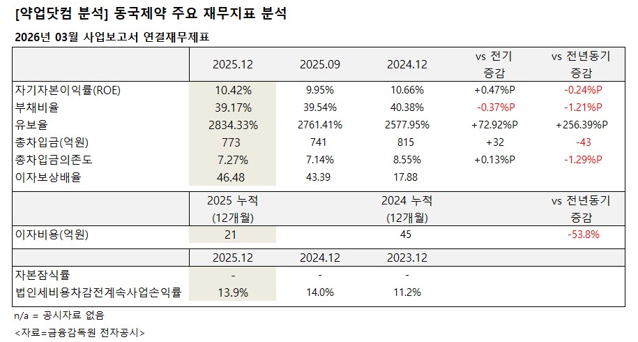 이자보상배율은 46.48로 전년 17.88 대비 크게 상승하며 이자 지급 능력이 개선됐다. 이자비용은 21억원으로 전년 45억원 대비 53.8% 감소했다.