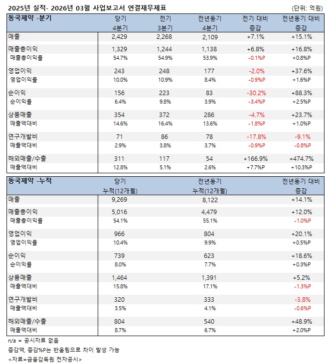 동국제약 사업보고서에 따르면 2025년 연결 기준 매출은 9269억원으로 전년 8122억원 대비 14.1% 증가했다. 영업이익은 966억원으로 전년 804억원 대비 20.1% 늘었다.