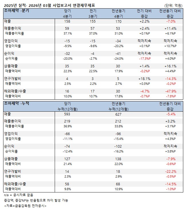 조아제약이 지난해 매출 감소에도 불구하고 영업손실 규모를 줄이며 수익성 개선 흐름을 보였다.