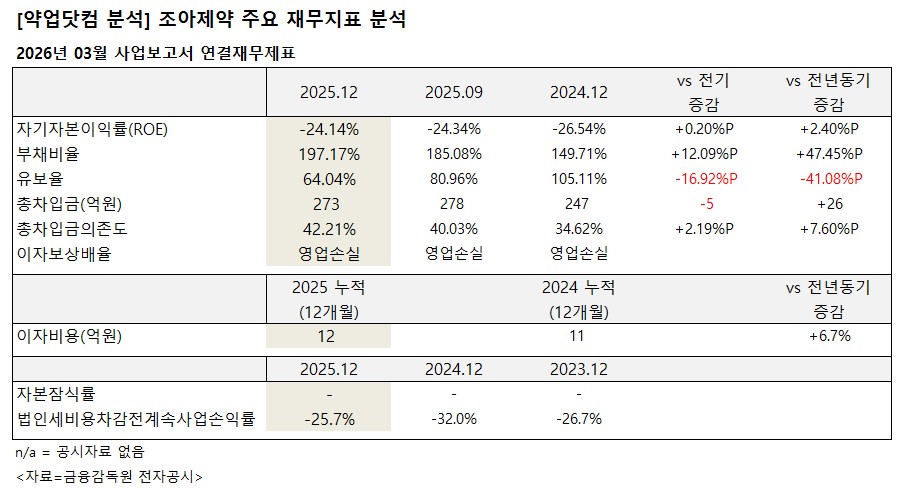 자기자본이익률(ROE)은 -24.14%로 전년 -26.54% 대비 소폭 개선됐지만 여전히 마이너스를 나타냈다.