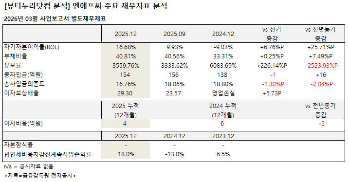 약업신문 자매지 화장품신문이 금융감독원 공시 2026년 3월 감사보고서(연결기준) 분석 결과 엔에프씨는 지난해 자기자본이익률(ROE)은 16.68%였다. 전기 (이하 1~9월) 9.93% 대비 6.76%p 높아졌다. 전년동기 -9.03% 대비 25.71%p 개선됐다.