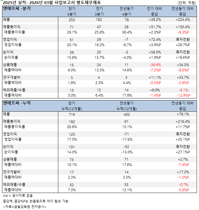 엔에프씨는 지난해 716억원의 매출을 기록했다. 전년 402억원 대비 78.1% 증가했다. 영업이익은 125억원으로, 71억원의 영업손실이 났던 전년 대비 흑자전환했다. 순이익은 101억원으로, 52억원의 순손실이 발생했던 전년 대비 흑자전환했다.