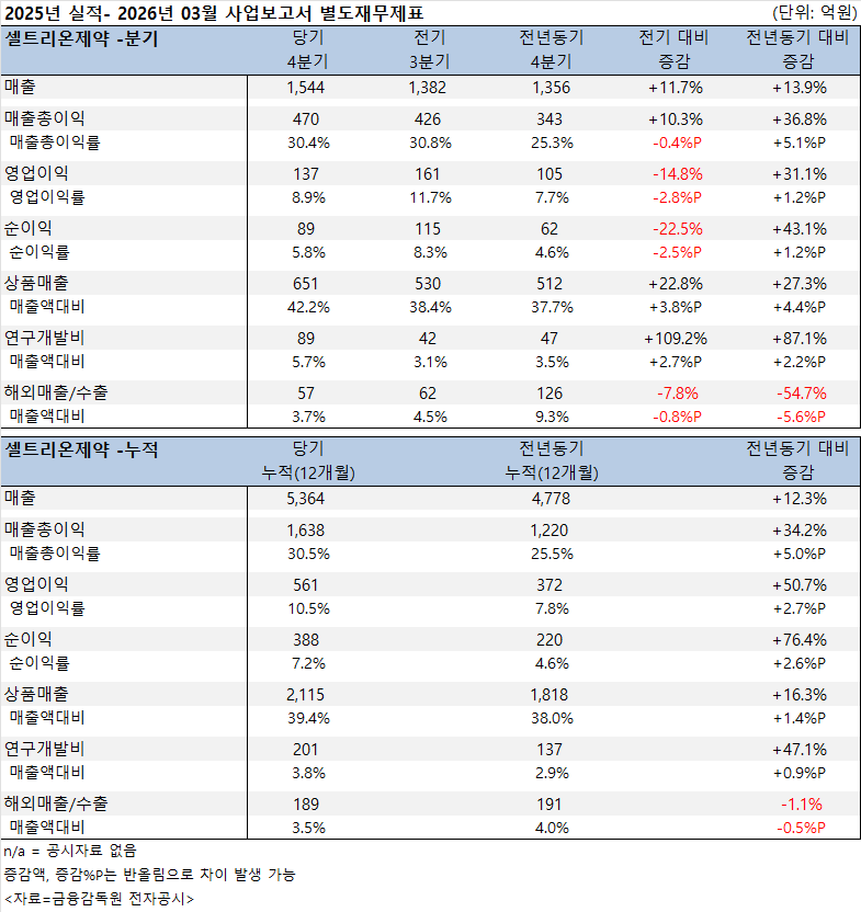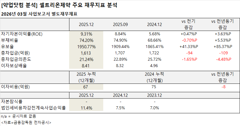 2026년 3월 공시된 셀트리온제약 사업보고서 별도재무제표에 따르면, 주요 재무지표에서 수익성과 재무안정성 지표가 동시에 개선됐다.