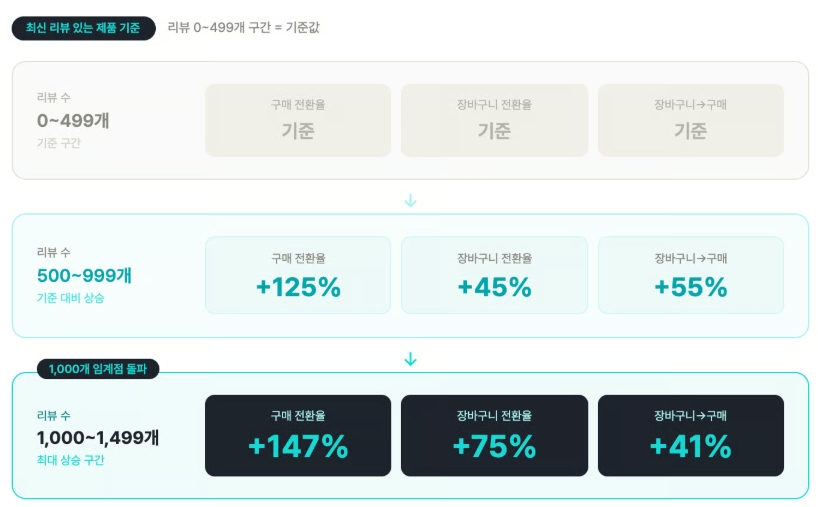 또, 최신 리뷰가 유지되는 상태에서 누적 리뷰 수가 늘어날수록 구매 전환율은 계단식으로 우상향했다. 리뷰 수는 기본 조건 위에서 전환율을 폭발적으로 끌어올리는 부스터 역할을 수행했다.