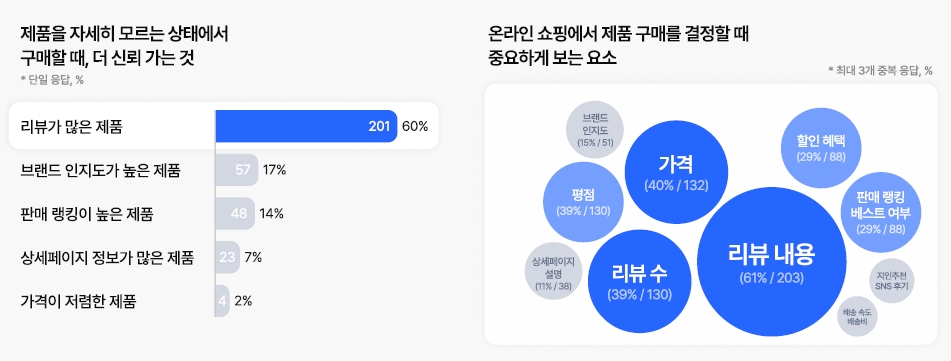 온라인 쇼핑에서 제품 구매 결정시 가장 중요하게 보는 요소로도 '리뷰 내용'(61%)과 '리뷰 수'(39%)가 압도적이었고, '리뷰 수/리뷰 내용'을 마지막 구매 결정을 도와주는 정보로 꼽은 소비자는 56%로 과반을 넘겼다.