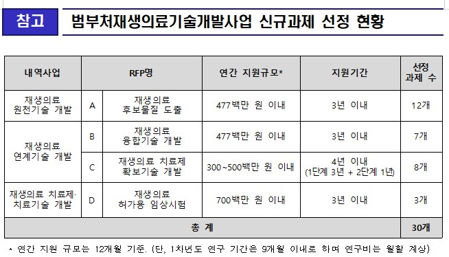 범부처재생의료기술개발사업은 과학기술정보통신부와 보건복지부가 공동으로 재생의료 분야 핵심·원천기술 발굴부터 치료제 및 치료기술 임상단계까지 전주기를 지원하는 사업으로2021년부터 ‘30년까지 총 5,955억원(국비 5,423억 원, 민간 532억 원)을 투입하는 국가연구개발사업이다.