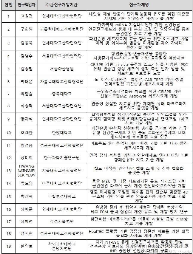 조인호 사업단장은 “이번에 선정된 신규과제들이 기초 연구에 머물지 않고 실질적인 치료제 개발과 임상 성과로 이어질 수 있도록 사업단 차원 전폭적 지원을 아끼지 않겠다”며 “대한민국이 글로벌 재생의료 시장을 선도하는 기술 강국으로 도약하는데 마중물 역할을 하겠다”고 밝혔다.