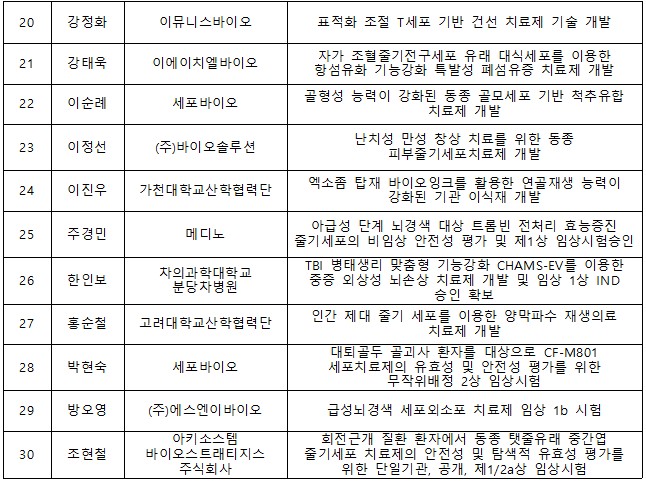 재생의료 치료제·치료기술 개발 분야(TRL 6~7)에서는 기업 주도의 허가용 임상시험을 지원하며, 총 3개 과제(15.75억 원) 선정을 통해 치료제 상용화에 적극적인 지원을 할 계획이다.