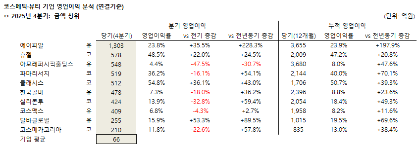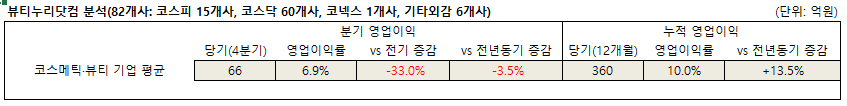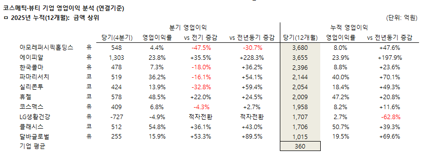 약업신문 자매지 화장품신문이 금융감독원 공시 2026년 3월 분기보고서(연결기준) 분석 결과, 화장품 관련 기업 82개사(코스피 15, 코스닥 60, 기타 외감 6)의 지난해 영업이익 평균은 360억원으로, 전년 대비 13.5% 성장한 것으로 나타났다. 영업이익률은 10.0%다. 4분기 영업이익 평균은 66억원으로 전기 대비 33.0%, 전년동기 대비 3.5% 각각 역성장했다. 영업이익률은 6.9%다.