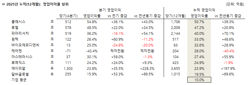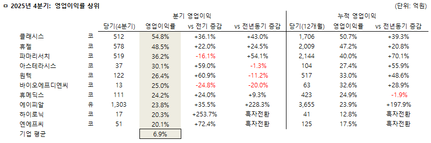 영업이익률이 가장 높은 기업은 클래시스로, 50.7%(1706억원=이하 영업이익액)를 기록했다. 전년 대비 39.3% 증가했다.