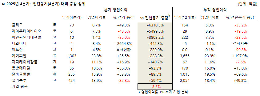지난해 4분기 기준 전년동기 대비 영업이익액 증가율이 가장 큰 기업은 클리오다. 증가율은 무려 6310.3%. 지배기업 49억원, 종속기업등 21억원이 증가하면서 전년대비 69억원 늘어난 70억원의 영업이익을 기록했다.