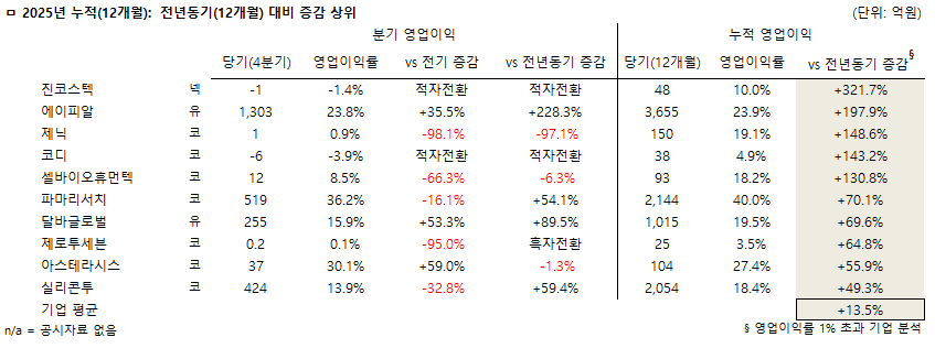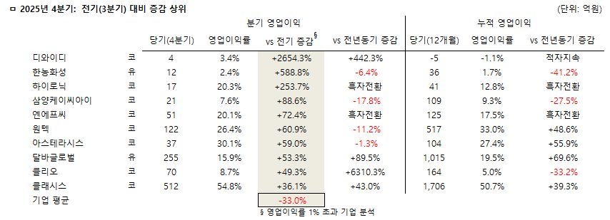 △2025년 누적 영업이익액 전년 동기 대비 증가율 상위 10개사