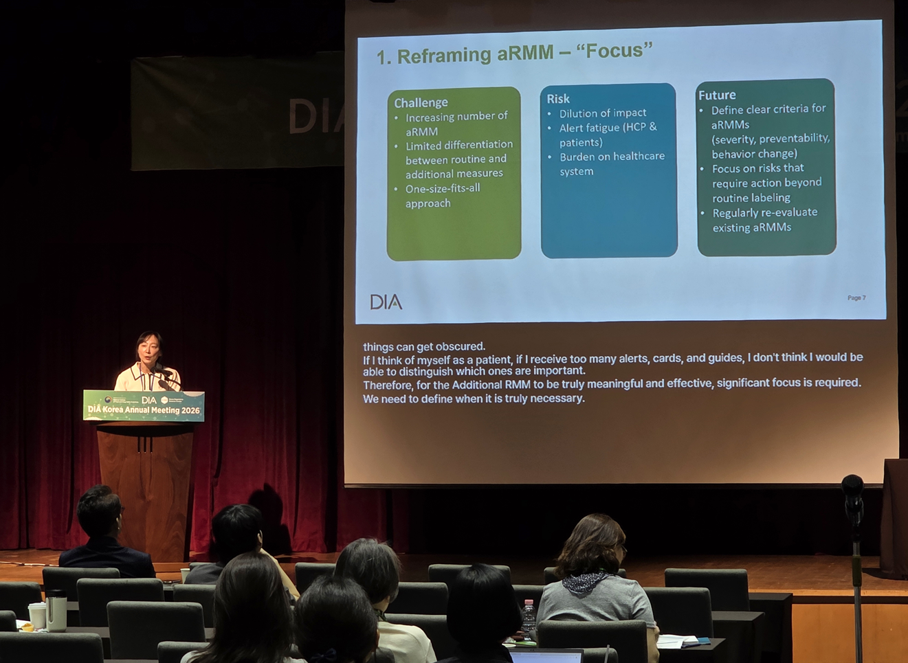 암젠코리아 오윤선 Country Head of Global Patient Safety는 15일 열린 ‘DIA Korea Annual Meeting 2026(연례회의)’의 세션 4 ‘의료 소통 인터페이스: 과학, 환자, 임상 현장을 연결하는 가교(Medical Communication Interfaces: Bridging Science, Patients, and Practice)’에서 ‘추가 위해최소화 조치(aRMM)를 통한 의료 커뮤니케이션 강화: 이해관계자 전반의 효과적인 위험 커뮤니케이션 보장(Enhancing Medical Communication through Additional RMM: Ensuring Effective Risk Communication across Stakeholders)’를 주제로 발표하며, Additional Risk Minimization Measures(추가적 위험 최소화 조치, 이하 RMM)의 역할과 한계를 짚고 향후 발전 방향을 제시했다.